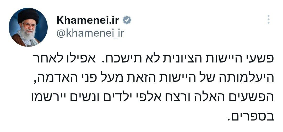 جاء ذلك في تدوينة لسماحة قائد الثورة الاسلامية، نشرت باللغة "العبرية" اليوم الاربعاء عبر حساب Khamenei.ir، في منصة "اكس" للتواصل الاجتماعي.