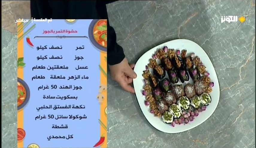 قدمت السيدة ابتسام شمص ضمن فقرة الطبخ في برنامج الأسرة " خلية حب" طريقة تحضير حشوة التمر بالجوز: