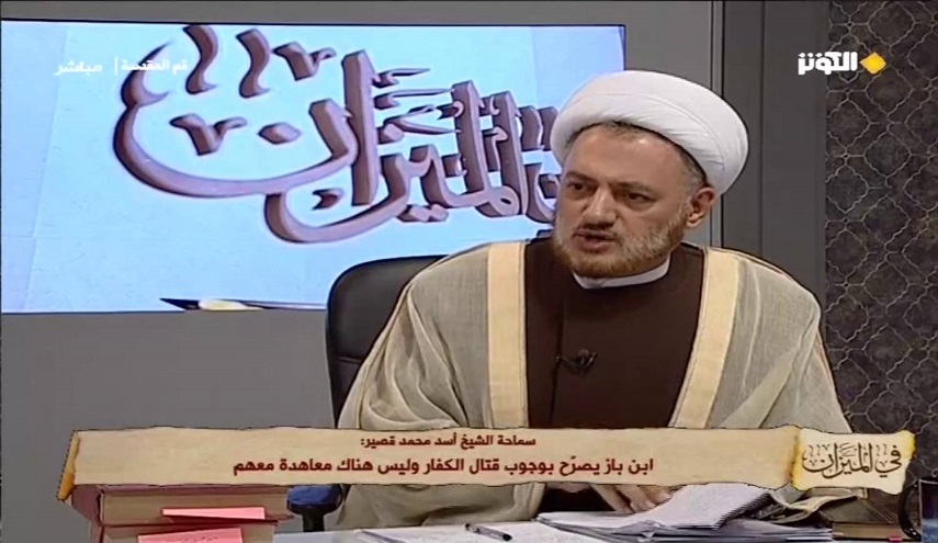 قال سماحة الشيخ أسد محمد قصير: ابن باز صرح بشكل واضح لا يوجد معاهدة على بعض فتاواهم اما ان تشهد او يقتل، ان قضية فتح باب قتل الناس مسألة جدا مهمة بدأت القضية بقتل الناس ثم جاء الوهابية حكمت على المسلمين كافة بالشرك والكفر وطبقوا عليهم كل هذا الحديث(حديث أمرت أن أقاتل الناس ...)