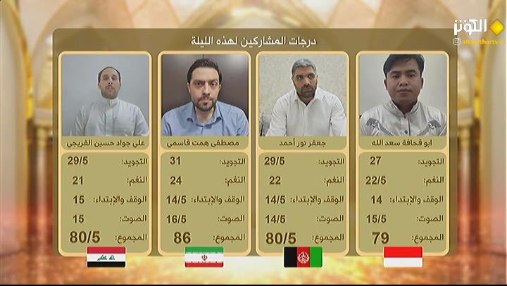 والمتسابق المشارك من العراق "علي جواد حسين الفريجي" قد حصل علی 80.5 درجة.