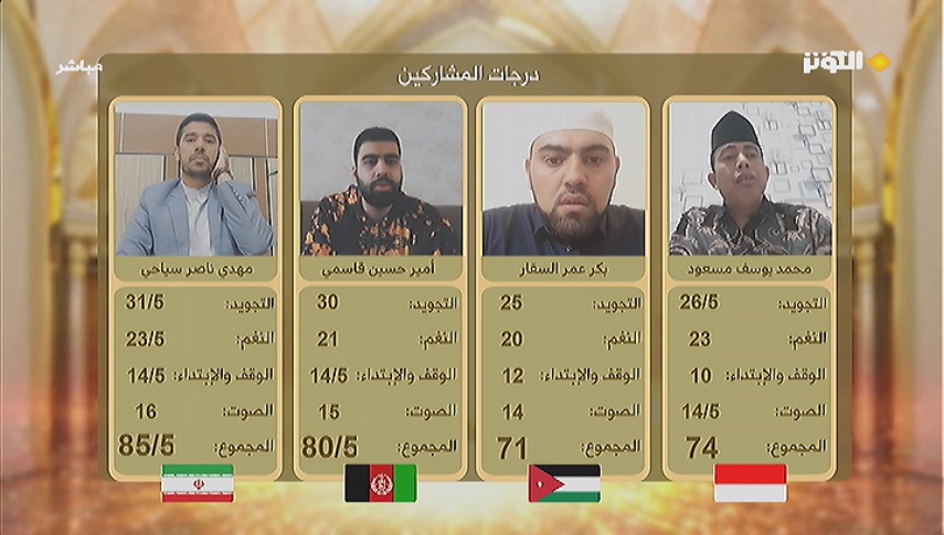 قد حصل المتسابق المشارك من إندونيسيا "محمد يوسف مسعود " قد حصل على 74 درجة.