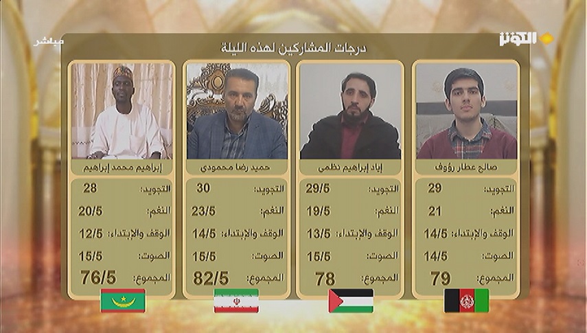 قد حصل المتسابق المشارك من أفغانستان "صالح عطار رؤوف " قد حصل على 79 درجة. وحصل المتسابق المشارك من فلسطين " أياد إبراهيم نظمي " على 78 درجة. والمتسابق المشارك من إيران " حميد رضا محمودي " قد حصل على 82.5 درجة. والمتسابق المشارك من موريتانيا " إبراهيم محمد إبراهيم " قد حصل علی 76.5 درجة.