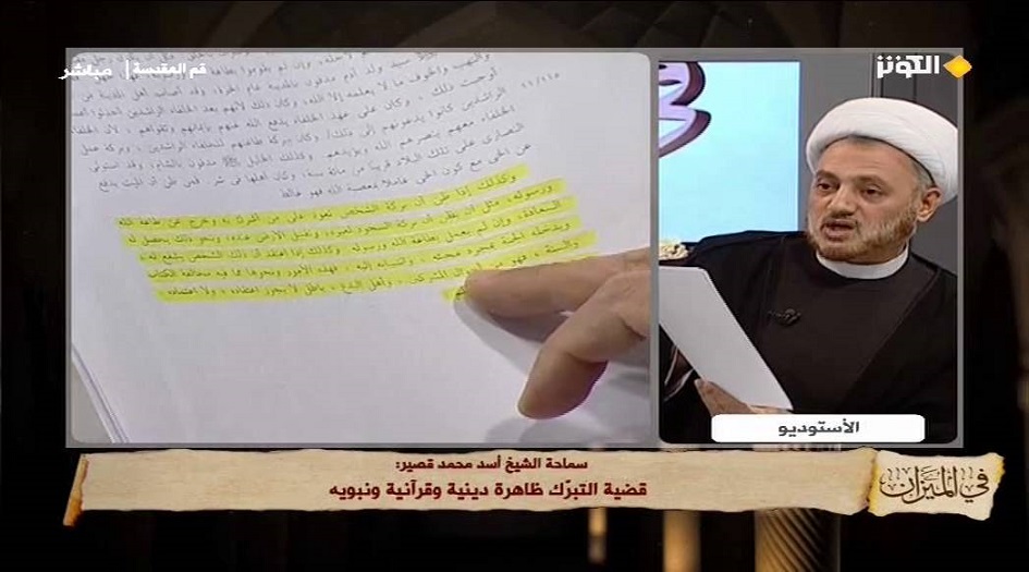 وقال سماحة الشيخ قصير: التبرك ظاهرة قرآنية ونبوية ودينية، مسئلة التبرك موجودة في كل المنظومات الدينية، والتبرك هي قضية سائدة وشائعة بين الصحابة "رضوان الله تعالى عليهم" التبرك هي قضية كالشمس في رابعة النهار من جهة مشروعيتها وكذلك على مستوى الممارسة.