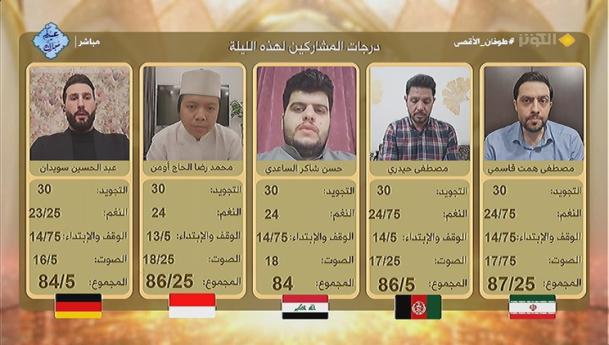 ثم يليه القارئ الأفغانستاني بالمرتبة الثانية مصطفى حيدري و يحصل الرتبة الثالثة القارئ الإندونيسي محمدرضا الحاج أومن ثم يحصد الرتبة الرابعة القارئ عبد الحسين سويدان من ألمانيا ويكون خامس قراء هذه النسخة، القارئ حسن شاكر حمود الساعدي من العراق .