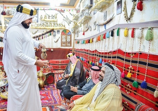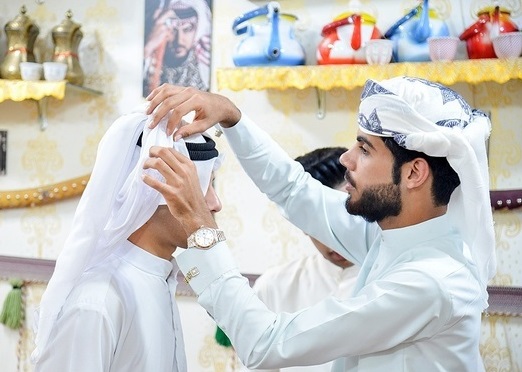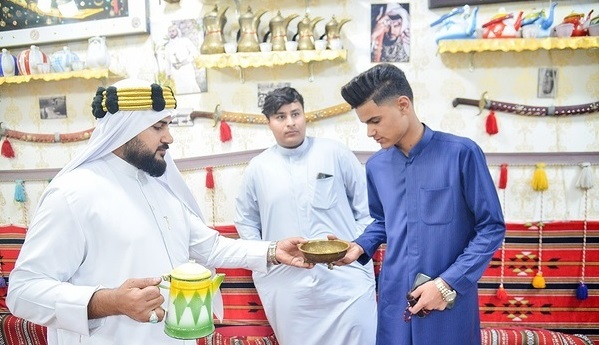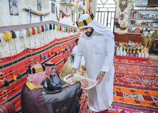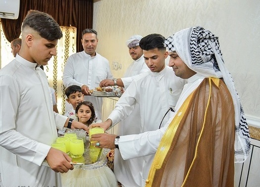 وبعد أداء صلاة عيد الفطر في المساجد، يتجه الشباب نحو منازل الأقارب الأكبر سناً، ثم إلى منازل جميع الأقارب والأصدقاء، ويتبادلون التهاني ويتناولون الحلويات والمكسرات والقهوة العربية على موائد تفرش في البيوت والتي تسمى بـ"سفرة العيد".