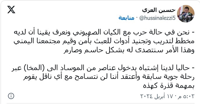 وقال نائب وزير الخارجية في حكومة صنعاء "حسين العزي" في تغريدة له على منصة "اكس" : حاليا لدينا إشتباه بدخول عناصر من الموساد الى (المخا) عبر رحلة جوية سابقة.