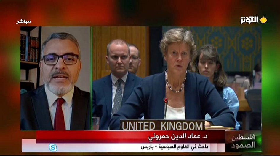 قال عماد الدين حمروني : ماحدث في مجلس الأمن هو انتصار للشعب الفلسطيني وكفاحه وصموده منذ أكثر من 7 عقود من أجل إستعادة أراضيه وحقوقه ،فإننا نشهد التفاف كل دول العالم تقريباً حول فلسطين وشعبها، فالعلم الفلسطيني اليوم يرفرف في مختلف دول العالم وقد أصبح قضية إنسانية .