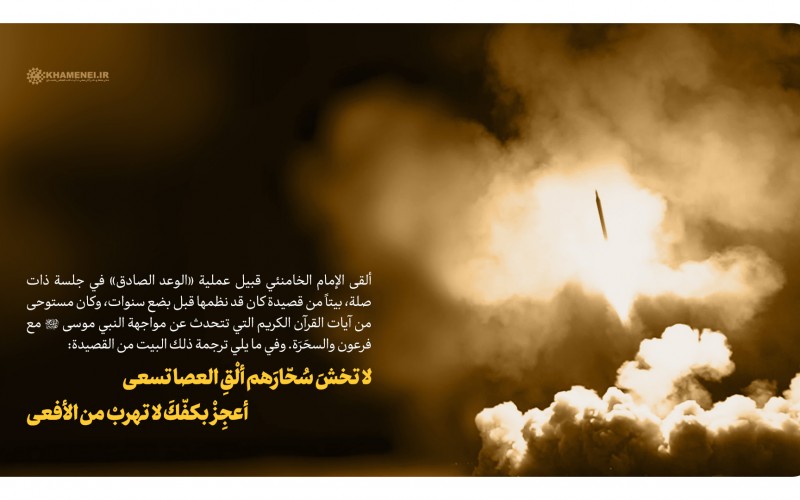 هذه القصيدة نظمها قائد الثورة الإسلامية قبل بضع سنوات، وقد ألقى سماحته هذا البيت من القصيدة قُبيل عملية «الوعد الصادق» في جلسة ذات صلة. في ما يلي ترجمة ذلك البيت من القصيدة: