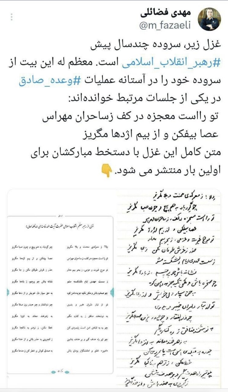 نشر مهدي فضائلي، عضو مكتب «حفظ ونشر آثار قائد الثورة الإسلامية»، على صفحته في تويتر (إكس)، بيتاً من قصيدة ألقاه الإمام الخامنئي قُبيل عملية «الوعد الصادق» في جلسة ذات صلة، فكتب: