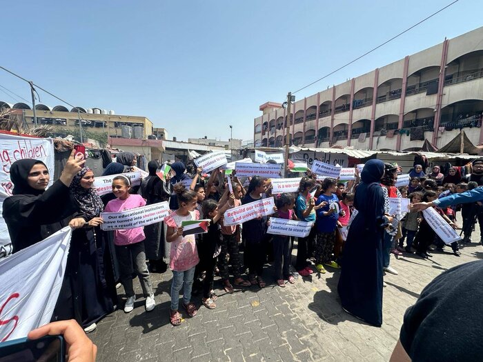 وأشارت، بانها تقف "مع الطلاب في مدرسة لم تعد مدرسة بسبب الحرب التي دمرت كل نواحي الحياة من صحة وتعليم"؛ موضحا انه "بعد سبعة اشهر من الحرب وتدمير الجامعات ضاع المستقبل التعليمي لنحو ٦٠٠ الف تلميذ يحتاجون لكل أشكال التضامن".