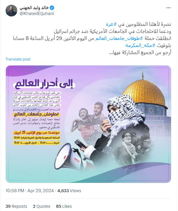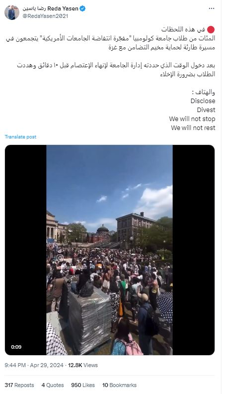 هذا وما زالت تتواصل ردود الفعل على ما يجري في حراك الجامعات الأمريكية والأوروبية من حراكٍ قويٍ بدأ يتعرض للقمع والتنكيل حيث أمهلت إدارة جامعة كولومبيا في مدينة نيويورك الأمريكية الطلاب المحتجين حتى الثانية مساءً من الاثنين لفض اعتصامهم الداعم لقطاع غزة، وتوعدت بتعليق دراستهم بانتظار إجراء مزيد من التحقيقات.