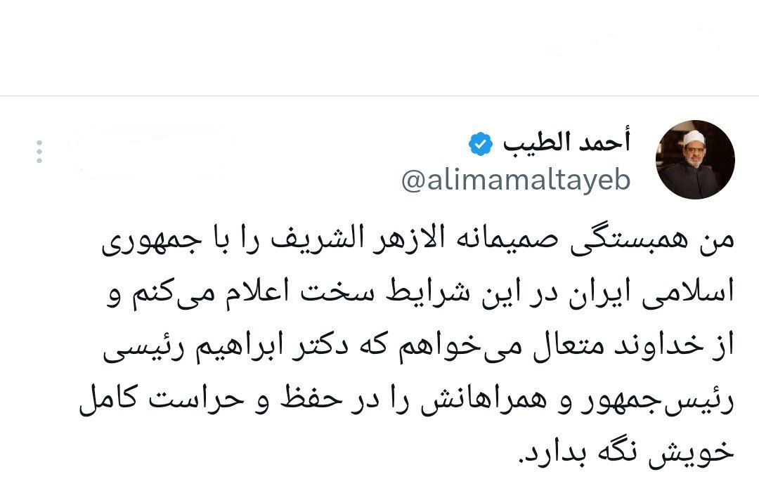 من همبستگی صمیمانه الازهر الشریف را با جمهوری اسلامی ایران در این شرایط سخت اعلام میکنم و از خداوند متعال میخواهم که دکتر ابراهیم رئیسی رئیسجمهور و همراهانش را در حفظ و حراست کامل خویش نگه بدارد.