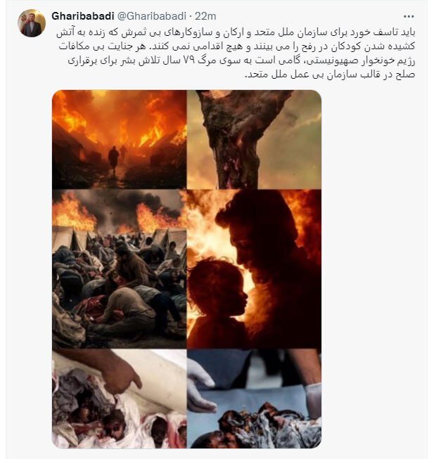 وفي منشور له عبر حسابه الرسمي على مواقع التواصل الاجتماعي ، وفي اشارة الى جريمة الكيان الصهيوني باستهدافه خيم النازحين والمحرقة التي ارتكبها بحق الاطفال والنساء والابرياء العزل في مخيم برفح جنوب غزة، كتب غريب ابادي: " مما يدعو للاسف ان الأمم المتحدة وأجهزتها وآلياتها العقيمة ترى الأطفال يحرقون أحياء في رفح ولا تحرك ساكنا."
