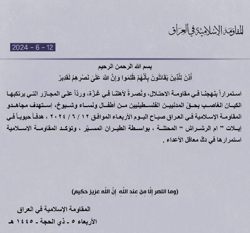 وأصدرت المقاومة الاسلامية في العراق بيانًا حول العملية هذا نصه: بسم الله الرحمن الرحيم أُذِنَ لِلَّذِينَ يُقَاتَلُونَ بِأَنَّهُمْ ظُلِمُوا وَإِنَّ اللَّهَ عَلَىٰ نَصْرِهِمْ لَقَدِيرٌ استمرارًا بنهجنا في مقاومة الاحتلال، ونُصرةً لأهلنا في غزّة، وردًّا على المجازر التي يرتكبها الكيان الغاصب بحقّ المدنيين الفلسطينيين من أطفال ونساء وشيوخ، استهدف مجاهدو المقاومة الإسلامية في العراق صباح اليوم الأربعاء الموافق 12 / 6 / 2024، هدفًا حيويًا في "إيلات" أم الرشراش المحتلة، بواسطة الطيران المُسيّر. وتؤكد المقاومة الاسلامية في العراق استمرارها في دكّ معاقل الأعداء. المقاومة الإسلامية في العراق الثلاثاء 5 - ذي الحجة - 1445 هـ
