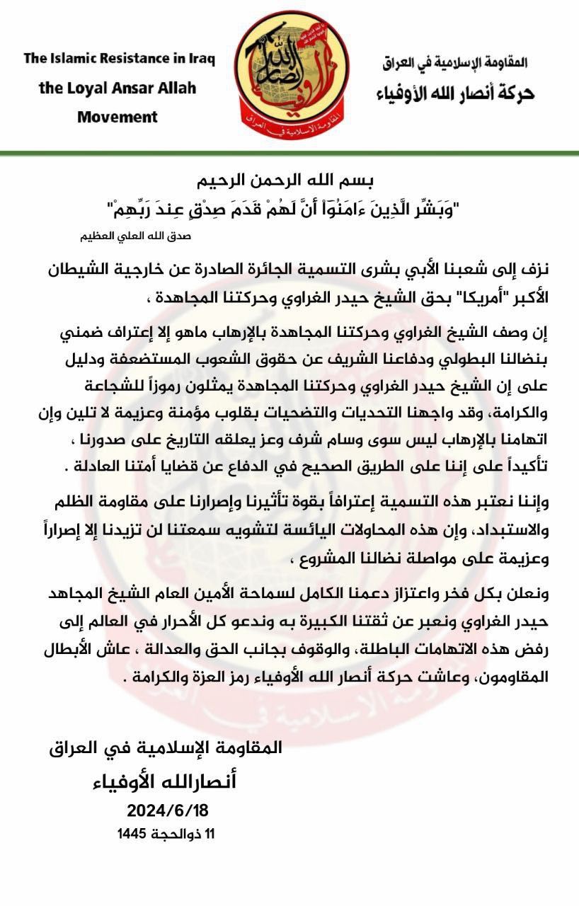 وأعلنت وزارة الخارجية الأمريكية أنها صنفت حركة “أنصار الله الأوفياء” العراقية وأمينها العام على قوائم الإرهاب. وجاء في بيان الخارجية الأمريكية أن حركة أنصار الله الأوفياء متحالفة مع إيران وتمثل جزءا من المقاومة الإسلامية بالعراق.