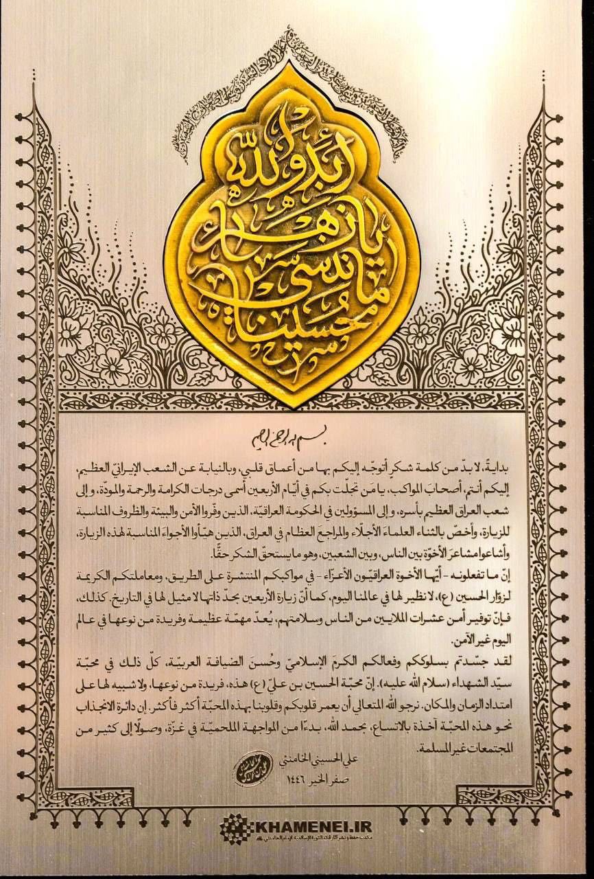 وتضمنت اللوحة تجديد قائد الثورة الاسلامية تقديره وشكره للعراق حكومة وشعباً على ما جرى بذله من جهود في استقبال الزائرين في زيارة إحياء ذكرى أربعينية الإمام الحسين وصحبه (عليهم السلام) .