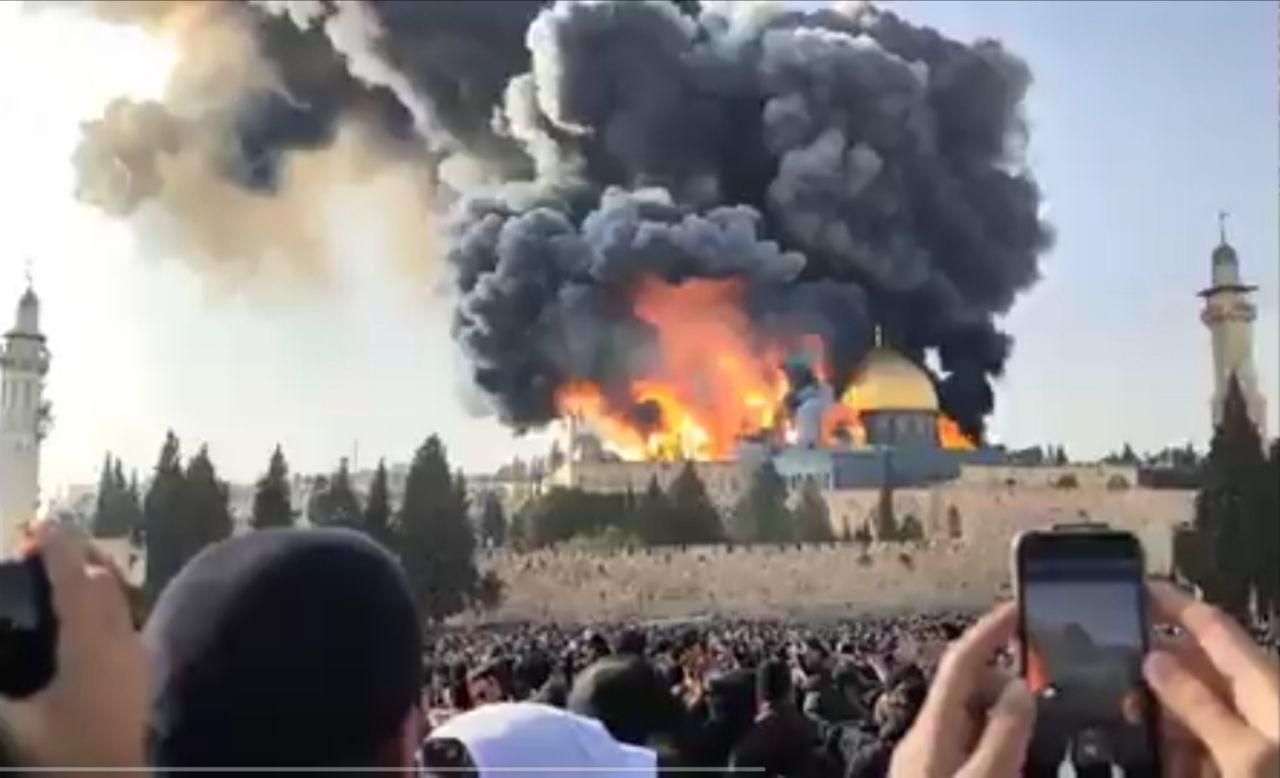 ونشرت جماعات الهيكل الاستيطانية المتطرفة، أمس الخميس، مقطع فيديو جديد يظهر فيه احتراق المسجد الأقصى المبارك، في إشارة إلى تدميره وبناء الهيكل المزعوم.