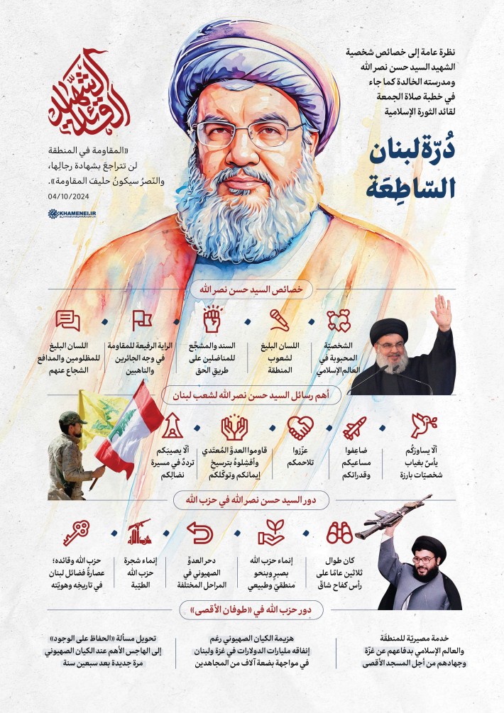 ينشر موقع KHAMENEI.IR الإعلامي إنفوغرافًا يُلقي نظرة عامة إلى خصائص شخصية الشهيد السيد حسن نصر الله ومدرسته الخالدة كما جاء في خطبة صلاة الجمعة لقائد الثورة الإسلامية بتاريخ 04/10/2024 في مصلّى الإمام الخميني (قده) الواقع في العاصمة طهران.