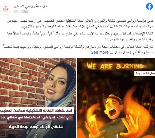 ونعت مؤسسة "رواسي فلسطين للثقافة والفنون والإعلام" الفنانة الفلسطينية في بيان لها جاء فيه "تنعى مؤسسة رواسي فلسطين للثقافة والفنون والإعلام الفنانة التشكيلية محاسن الخطيب، التي ارتقت شهيدة من جراء استهداف طائرات الاحتلال لمنزلها في شمالي غزة، حيث بقيت صامدة ترفض التهجير والنزوح".