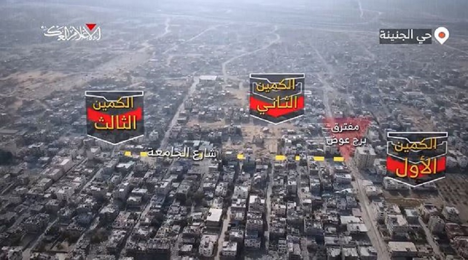 وفي بداية الفيديو، قالت القسام إن مقاتليها ظلوا في أماكنهم بعد تنفيذ الكمينين الأول والثاني، انتظارا لقوات الاحتلال في مقتلة الكمين الثالث رغم شدة القصف المدفعي والجوي على حي الجنينة.