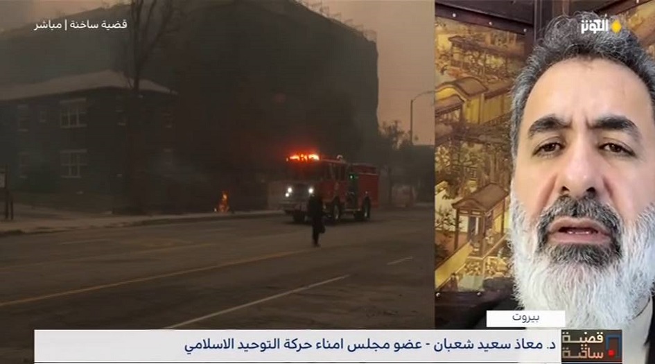 وأردف الدكتور معاذ : بعيداً عن موقف الشماتة من الإدارة الامريكية ، نحن ننظر إلى كارثة الحريق في أمريكا نظرة إنسانية من خلفيتنا الدينية والثقافية ، وإن المواطنون في امريكا قد ابتلوا بالإدارة التي تحكم والتي فشلت في احتواء الكوارث في البلاد .
