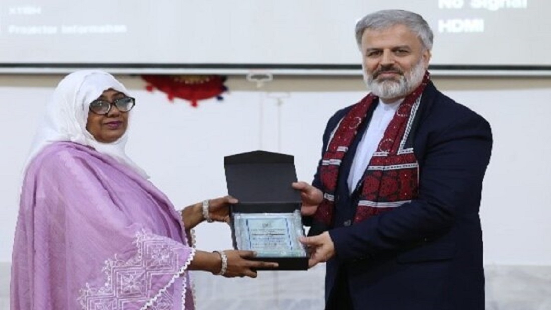 وفي ختام الحفل تم تكريم رئيس الملحق الثقافي الإيراني بتمثال تذكاري، ثم ألقى طالبي نيا كلمة قال فيها إن اللغة تعد من أهم جوانب الهوية الوطنية لأي مجتمع متجذر، مضيفا: "يجب أن نفخر بلغاتنا المحلية والوطنية".