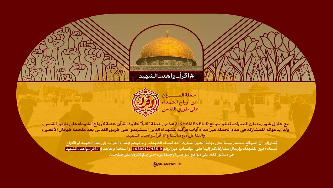 يُشار إلى أنّ موقع KHAMENEI.IR الإعلامي سينشر يومياً حتى نهاية الشهر المبارك أحد أسماء الشهداء. وندعوكم لإهداء الثواب إلى هذا الشهيد أو اقتراح أسماء أخرى للشهداء وإرسال صورة أو فيديو لمشاركاتكم إلينا على الواتساب عبر الرقم +989912748519 أو استخدام وسم #اقرأ_واهد_الشهيد في منشوراتكم على مواقع التواصل الإجتماعي، حتى يتمّ نشرها على صفحتنا.