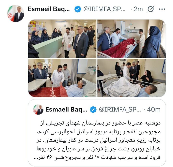 كتب المتحدث باسم وزارة الخارجية وقال: قمت مساء امس الاثنين بزيارة مستشفى شهداء تجريش للترحيب بالجرحى الذين أصيبوا في الانفجار الصاروخي الإسرائيلي أمس. سقطت قذيفة أطلقها الكيان الصهيوني بجوار المستشفى مباشرة، في الشارع المقابل، خلف إشارة مرور حمراء، على المارة والسيارات، ما أدى إلى استشهاد 17 شخصاً وإصابة 46 آخرين.