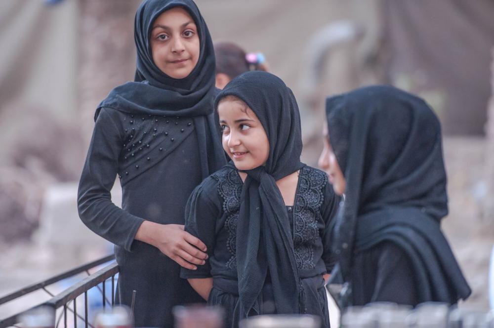 فها هي الطفلة زينب بصُحبة إخوانها ينصبون موكبهم الخدميّ الصغير وكلّهم لهفة لتقديم الخدمة البسيطة لمن يقطعون الطريق سيراً أمام دارهم متوجّهين الى كربلاء، حيث تُلاحق عيناها البرّاقتان وجوه الزائرين متوسّلة إيّاهم شرب الماء من موكبهم صغير الحجم كبير المعنى، وعلى مسافةٍ ليست بالبعيدة شاهدنا الطفلة فاطمة التي لم تبارح مكانها وسط الطريق وهي تحمل الإناء ساقيةً كلّ من مرّ بجانبها، كأنّ العيد لديها هو خدمة أبي عبد الله وزوّاره.
