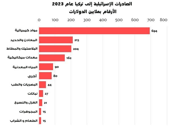 يعتقد الخبراء أن جزءًا كبيرًا من الفولاذ المستخدم في الصناعات العسكرية الإسرائيلية، التي تزود الأسلحة لقتل الشعب الفلسطيني، يتم توفيره عبر تركيا. بالإضافة إلى ذلك، يتم توفير حوالي نصف النفط الذي تحتاجه إسرائيل أيضًا عبر خط أنابيب يمر عبر تركيا.