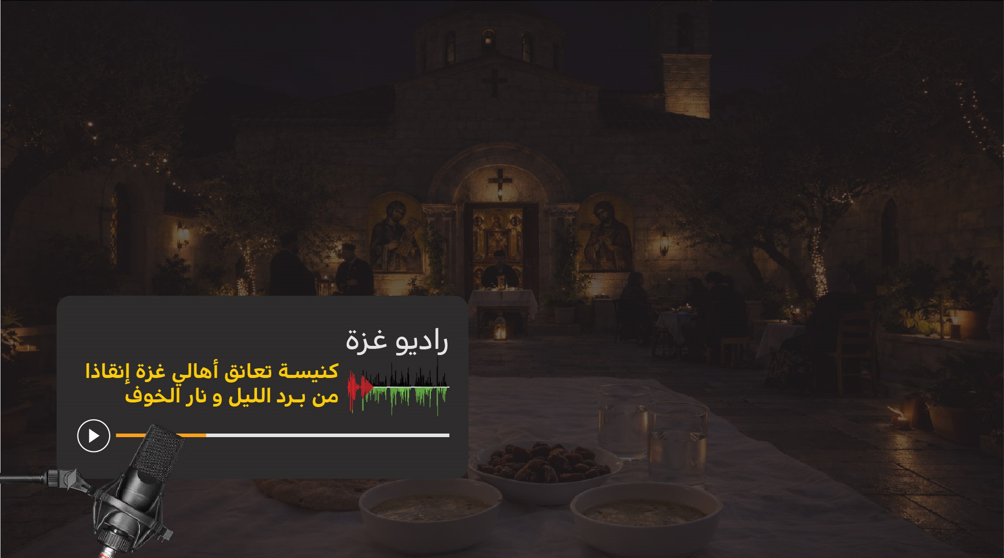 كانَ ذلكَ المكانُ كنيسةً، تُسمّى: كنيسة القديس بورفيريوس. لم يكن الهدفُ الاحتفالَ بالأعياد الآن، بل كانَ إنقاذُ الناسِ من بردِ الليلِ ونارِ الخوف. وفي رمضان، تحوّلَ الفناءُ إلى مَائدةٍ واحدةٍ — مائدةٌ تقاسمَت فيها الأصواتُ والأنفاسُ والصلواتُ والأمل.