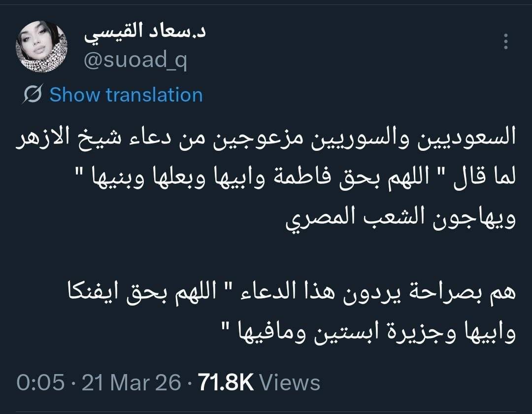 إن شيخًا من جامعة الأزهر اختتم دعاءه بقوله: «اللهم بحق فاطمة وأبيها وزوجها وبنيها»، مما أثار استياء بعض السعوديين والسوريين، الذين قاموا بمهاجمة المصريين وسبّهم بسبب هذا الدعاء.