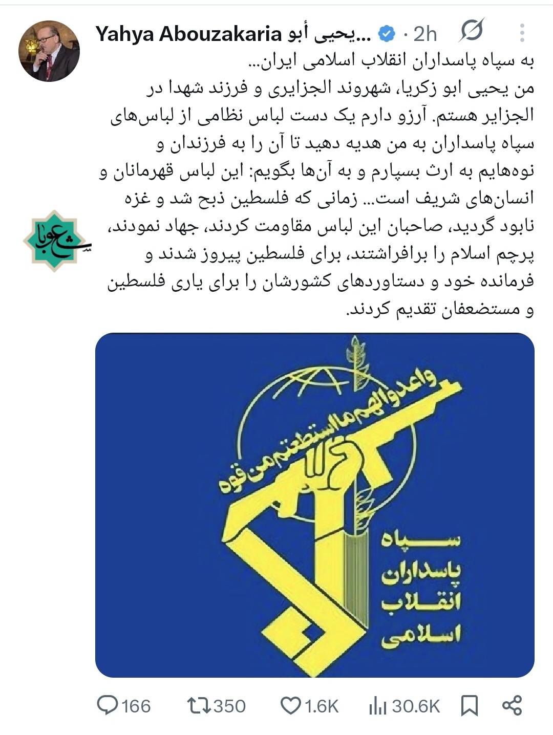وأضاف أن هذا الزي، بالنسبة له، يرمز إلى الصمود والجهاد ورفع راية الإسلام، مشيراً إلى أنه يجسد مواقف داعمة لفلسطين والمستضعفين، وفق تعبيره.