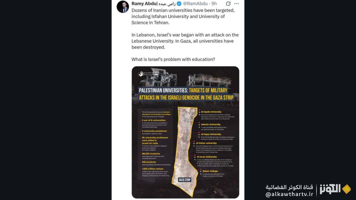 وتساءل عبده عن سبب استهداف المؤسسات التعليمية، معتبراً أن ذلك يعكس مشكلة عميقة لدى الكيان الصهيوني تجاه التعليم والبنية الأكاديمية في المنطقة.