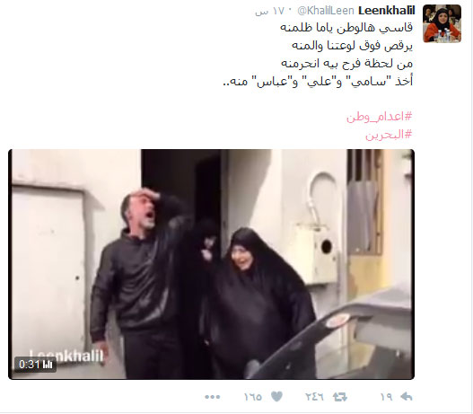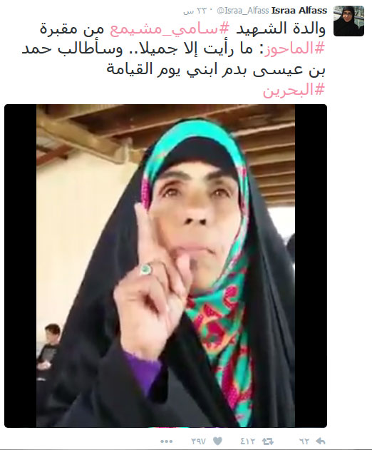 كما تداول الناشطون هاشتاغ # البحرين_ينتفض و# شلت_يدك_ياحمد. المتضامنون مع الشعب البحريني المظلوم وثورته السلمية عبّروا من خلال هذه الأوسمة عن غضبهم ورفضهم للجور والقمع المتمادي من قبل#السلطات_البحرينية التي لم تستثنِ وسيلة الا واعتمدتها في سبيل قهر ارادة الشعب. من سحب الجنسيات من المواطنين مرورًا بإطلاق رصاص الشوزن المحرم دولياً على المتظاهرين واعتقال الأطفال والشبان وأصحاب الرأي وقيادات المعارضة السلمية وصولاً الى التعرض لرموز الثورة البحرينية، فإعدام المعتقلين السياسيين على مرأى من العالم.