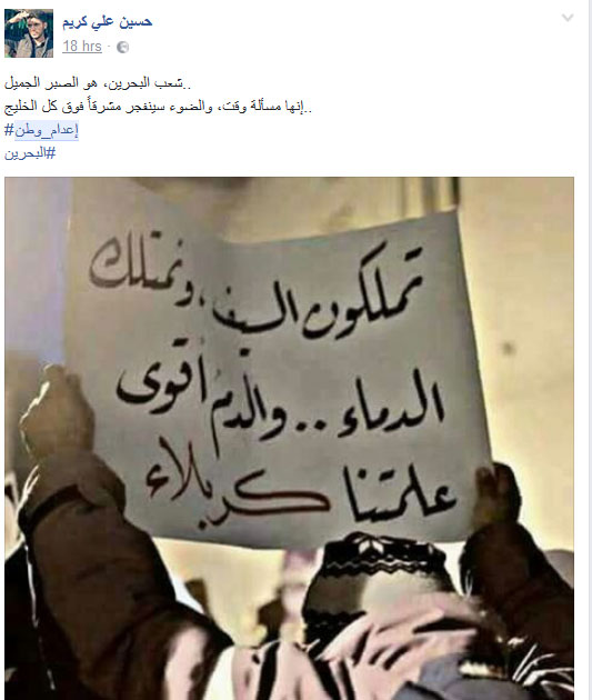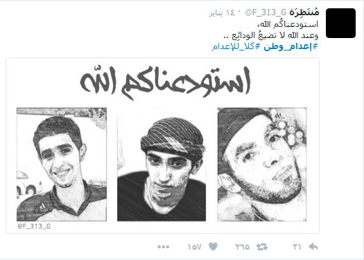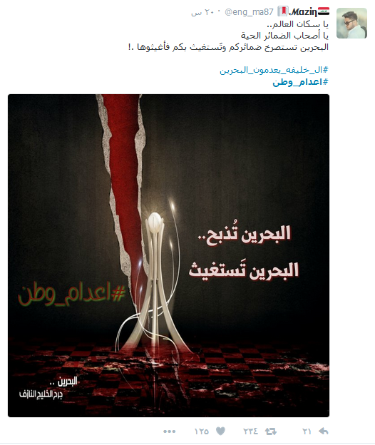 #عباس_السميع، #علي_السنكيس، #سامي_مشيمع، أقمار #البحرين الثلاثة ارتقوا في ليلة قهر مظلمة.  شبان مناضلون سعوا الى الحرية، واصبحوا أيقونات يفخر شباب الثورة البحرينية بحملها. الشهداء عباس، علي وسامي، أشعلوا بدمائهم القانية، وصبرهم الجميل، حرارة في القلوب، ترجمها الشباب العربي سيّما أبناء البحرين من خلال هاشتاغ #اعدام_وطن الذي احتل المرتبة الأولى في الهاشتاغات الأكثر تداولاً في البحرين، وحاز على أكثر من 666 ألف تغريدة منذ انطلاقه.