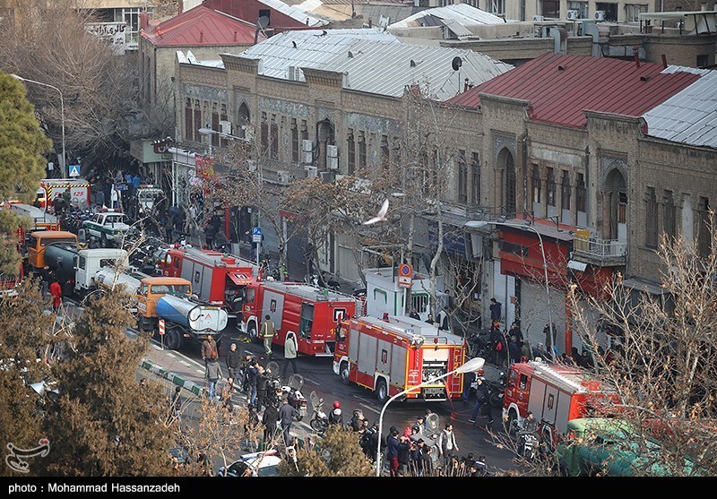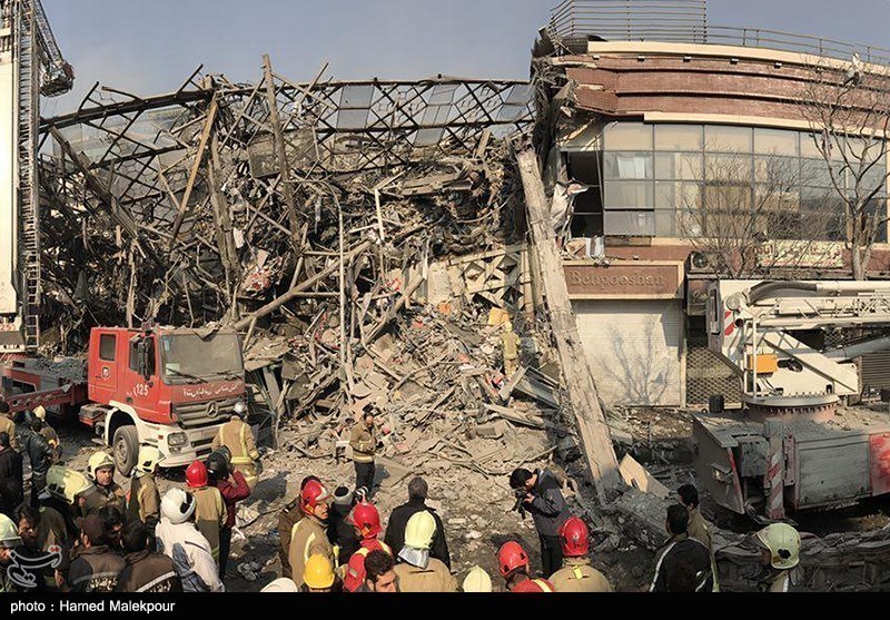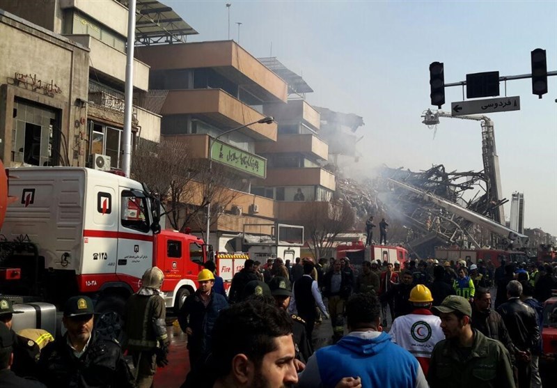 عشرات سيارات الإطفاء وعشرات رجال الإطفاء كانوا موجودين في المكان لإطفاء هذا الحريق منذ الصباح الباكر لكن البرج قد إنهار.