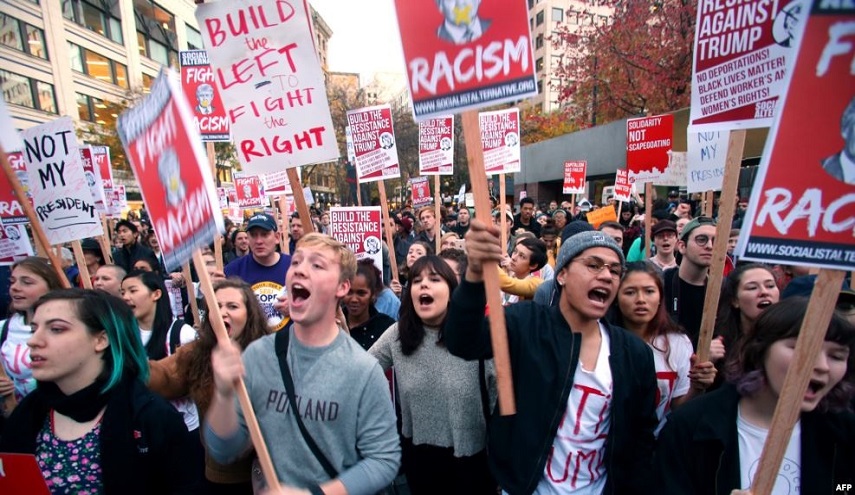 والقى ما بين 400 و5000 متظاهر مقذوفات على عناصر شرطة مكافحة الشغب على مقربة من البيت الابيض. وقلب المتظاهرون حاويات القمامة على الرصيف قبل ان يقوموا باحراقها.