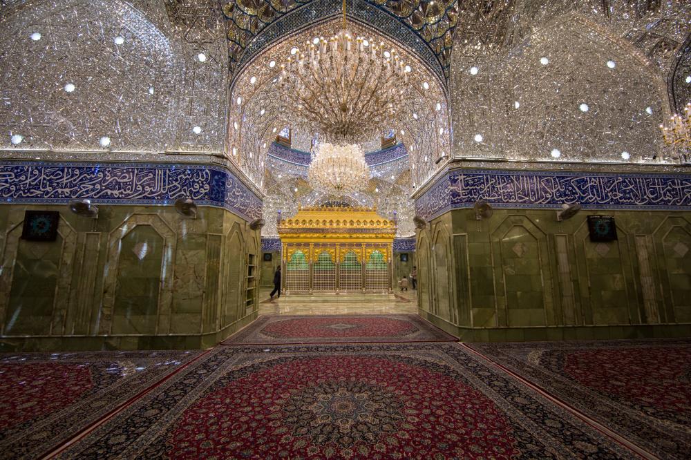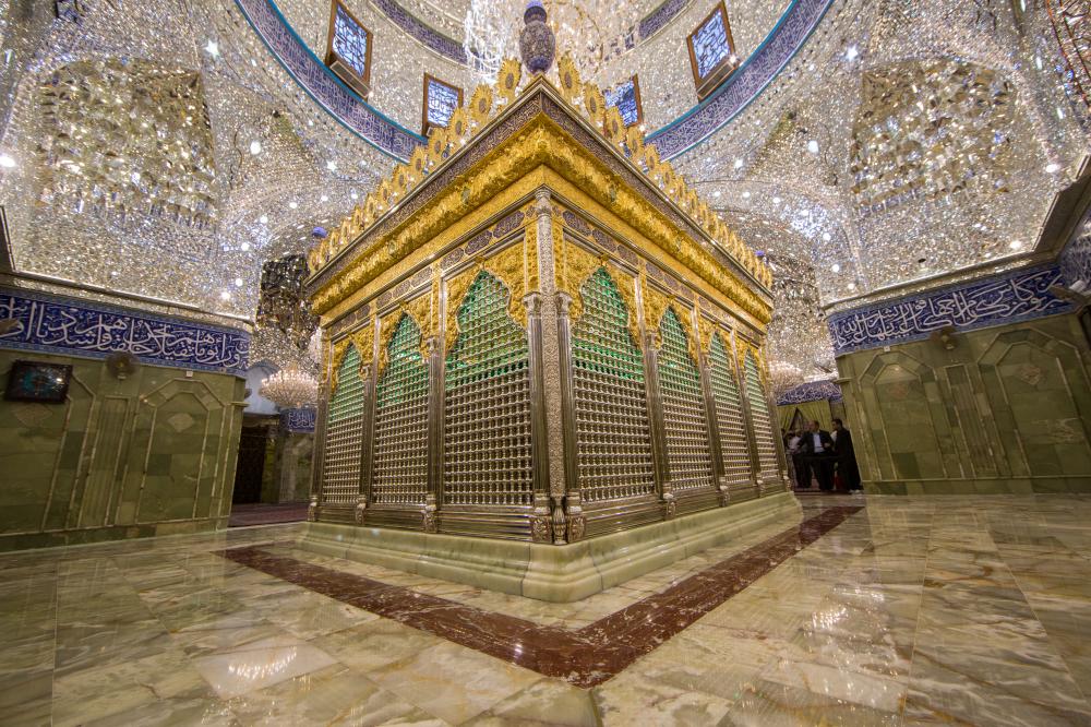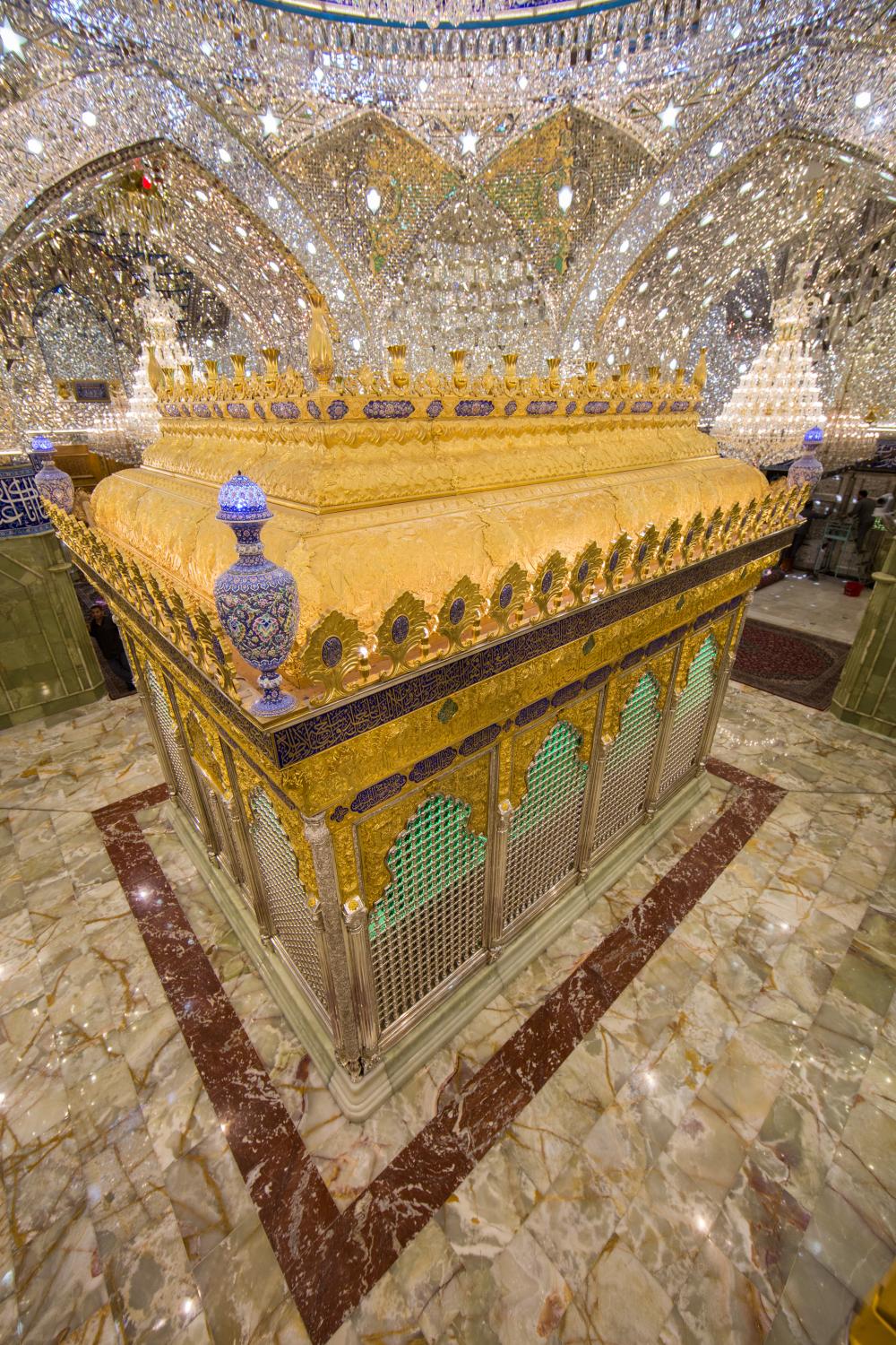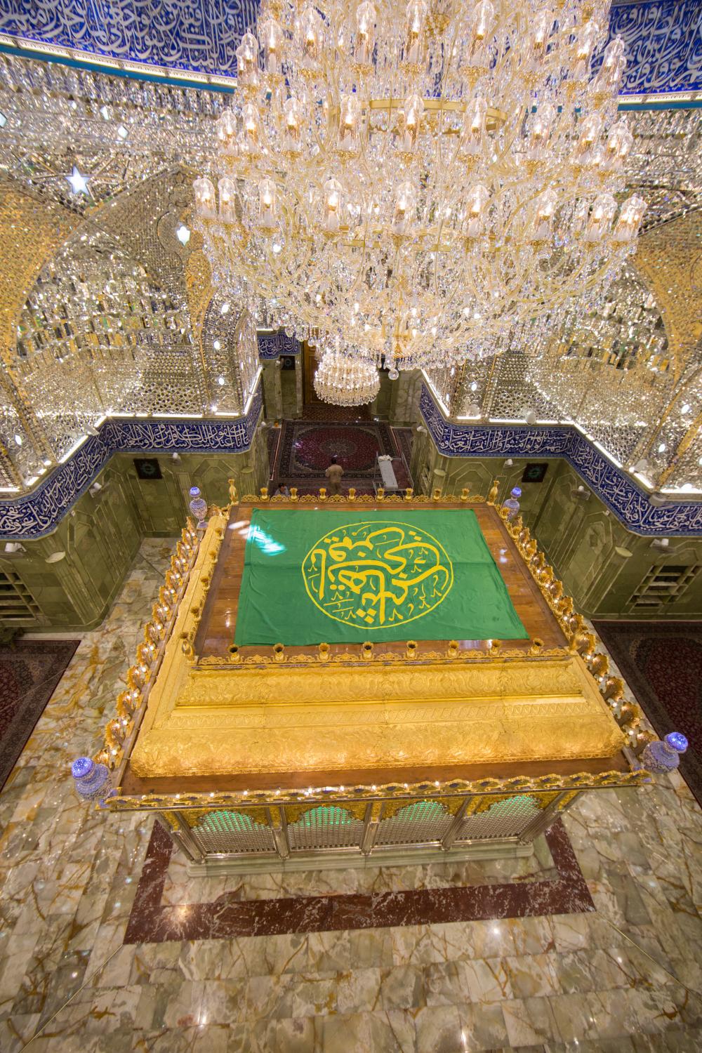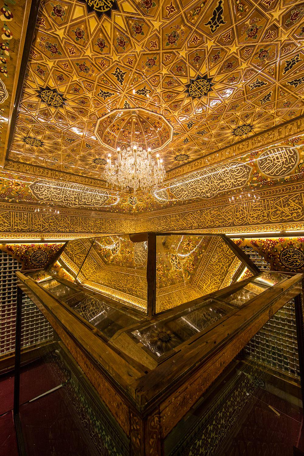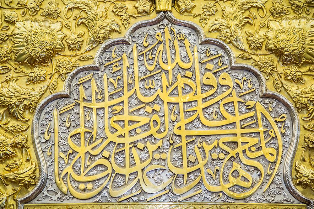 أسفل هذا التاج هناك شريطان ذهبيان من الكتابات بيد الخطاط العراقي فراس البغدادي.