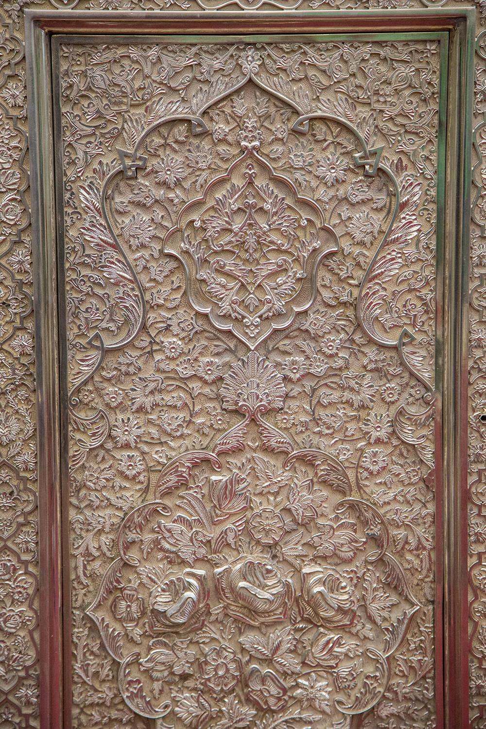 وأسفل هذين الشريطين هناك شريط فضي مزخرف يقع فوق الباب مباشرة تتوسطه آية قرآنية ( أُدْخُلُوْهَا بِسَلَامٍ آمِنِيْنَ ) وهي من الذهب أيضاً، خطّت كذلك بيد الخطّاط فراس البغدادي، حيث بلغ الذهب المستخدم في صناعتها ( 400 غم ).