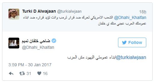 وقال "خلفان" في رده على أحد المتابعين له على موقع التدوين المصغر "تويتر" استنكر دفاعه عن قرارات الرئيس الاميركي دونالد ترامب الذي منع زيارة مواطني 6 دول عربية للولايات المتحدة: "ابناء عمومتي
