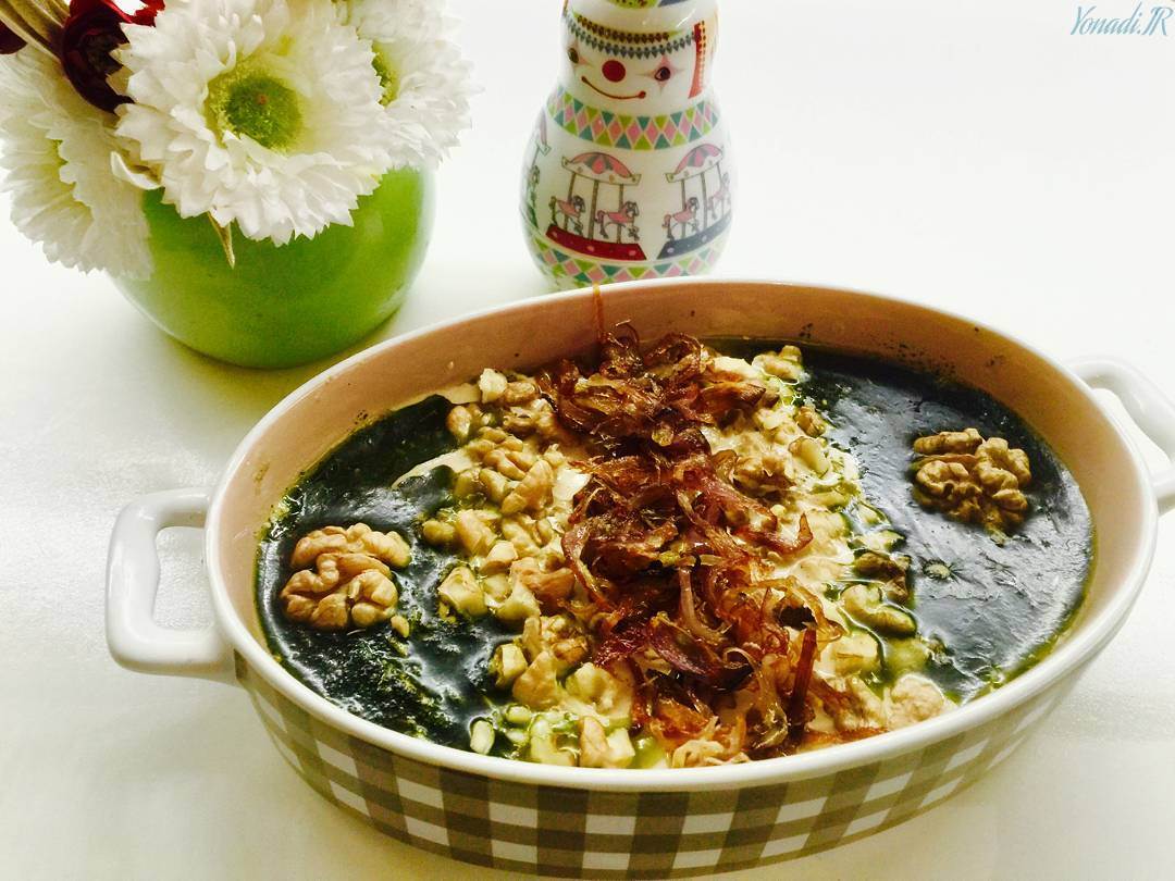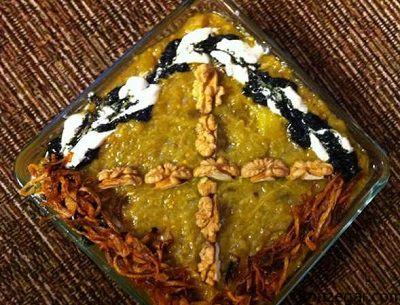 2- يحمر البصل مع الثوم في الزبدة ويضاف عليها الباذنجان المفروم مع الكشك (يقط) والنعناع، والملح. يقلب الجميع حتى يتجانس المزيج ثم يسكب كشك الباذنجان في طبق تقديم.
