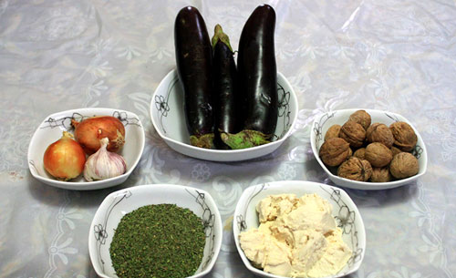 1- يقطع الباذنجان إلى شرائح سميكة تقلى في زيت غزير حار ثم ترفع وتفرم في المفرمة.