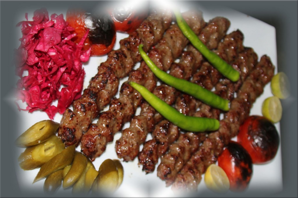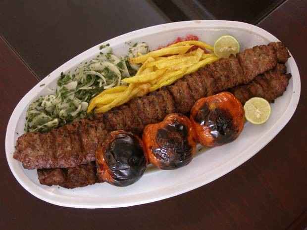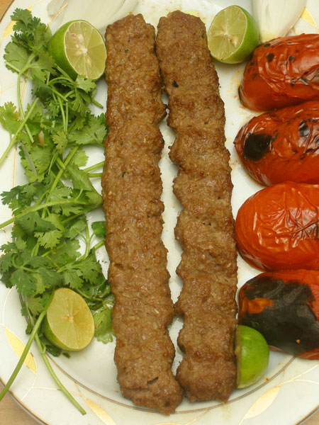 سخنت شواية كهربائية لتصبح حارة جدا قبل البدء بالشوي وشكلت اللحم عالاسياخ ولانها خشبية ناعمة فصار الكباب صغيرا ولكن لنمنحه منظر الكباب الايراني نضغط عاللحم برفق بالاصابع بالوسطى والسبابة لاكسابه منظر التعرجات