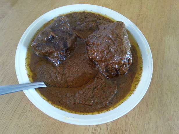 في الصورة الرئيسية الاكلة بعد ثلاث ساعات على نار هادئة جدا واختفى اغلب الماء وبقيت صلصة جوز كثيفة والجوز يتشرب الماء وينتفخ فبعد ان كان مطحونا صار فيه بعض حبيبات الجوز بالاضافة لصلصته الكثيفة