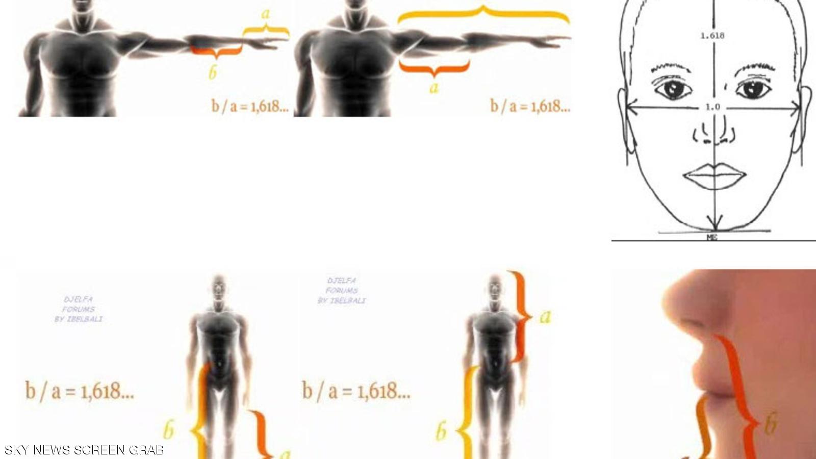 فوجه الإنسان المثالي مثلا يزخر بالعديد من الأمثلة على النسبة الذهبية التي أظهرتها قياسات المصممين والفنانين، فالرأس مستطيل الشكل ويحقق خط تمركز العينين فيه النسبة الذهبية، وكذلك النسبة في ساق الإنسان بين جزأيه الكبير والصغير، وذات النسبة تنطبق على جزأي الذراع، والمسافة فوق وتحت الفم.