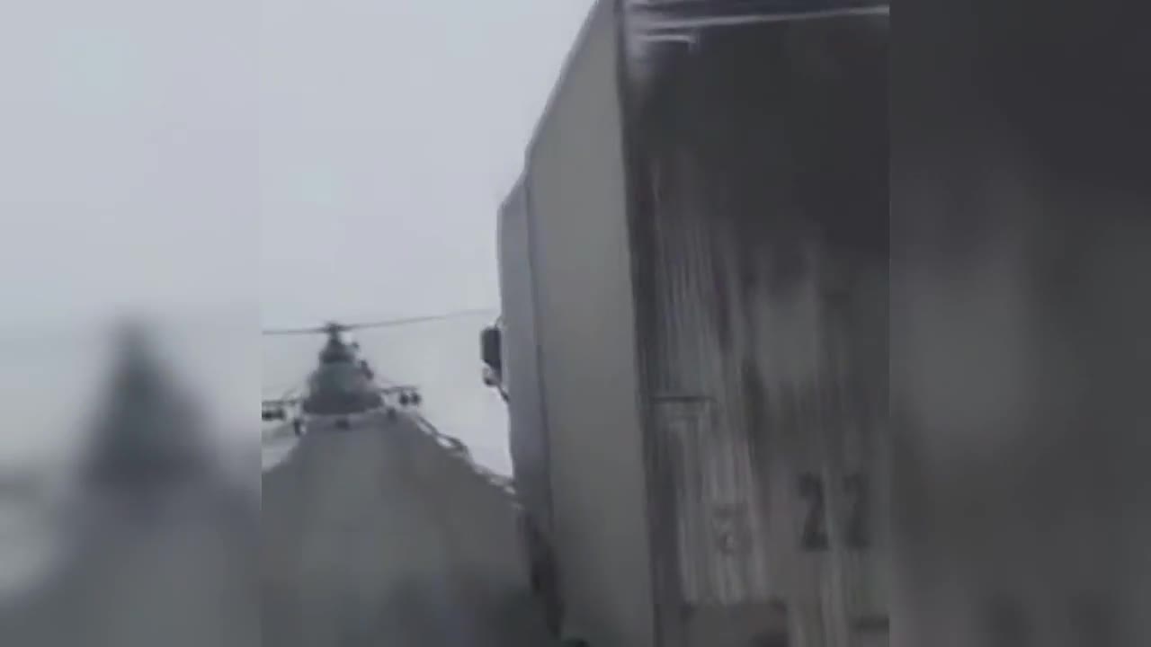 الفيديو التقطه قائد سيارة من كازاخستان لمروحية عسكرية لحظة هبوطها على الطريق، حيث توجّه قائدها ليسأل أحد سائقي السيارات عن اتجاهات الطرق، ثم أقلعت المروحية من جديد.