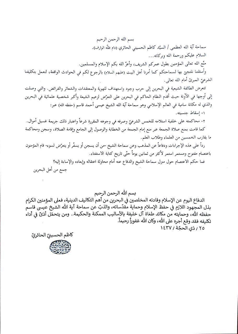 وفقاً لما أفادته وكالة أهل البيت (ع) للأنباء – ابنا -أجاب المرجع الديني سماحة السيد الحسيني الحائري عن أسئلة موجه إليه من قبل جمع من أهل البحرين حول ما يرتبط بسماحة الشيخ عيسى قاسم، بأنه من أهم التكاليف الدينية الدافع عنه ومن يتحمل الأذي يؤجر على ذلك.