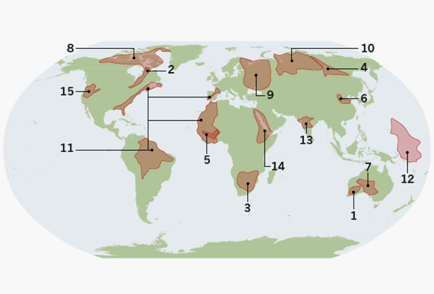 وتشكلت أقدم هذه المناطق منذ حوالي 242 مليون سنة في الجنوب الغربي لأستراليا الحديثة، وأصغرها منذ حوالي 17 مليون سنة في أمريكا الشمالية الغربية.