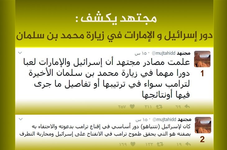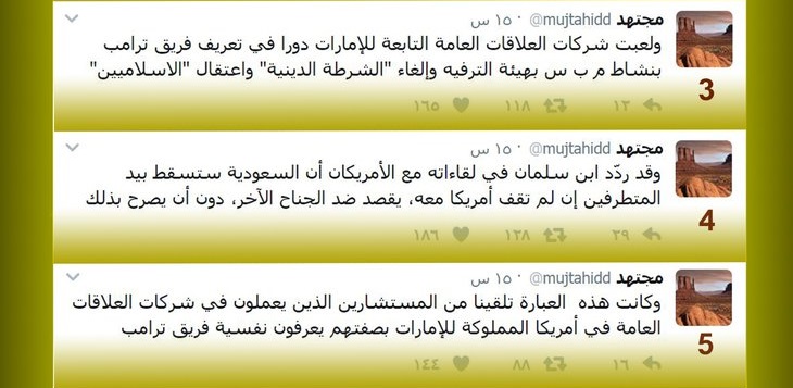 واضاف “مجتهد” يقول : وقد ردّد ابن سلمان في لقاءاته مع الأمريكان أن السعودية ستسقط بيد المتطرفين إن لم تقف أمريكا معه، (قصد ضد الجناح الآخر), دون أن يصرح بذلك.. وكان قد تلقن هذه العبارة من المستشارين الذين يعملون في شركات العلاقات العامة بأمريكا وهي مملوكة للإمارات, بصفتهم يعرفون نفسية فريق ترامب.